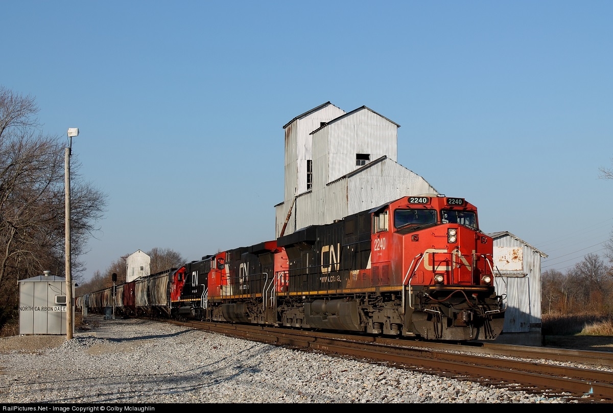| CN train A42391-01 slows for the 20 MPH speed restriction at the Carbondale yard office, about a 1 mile behind me. North Carbondale is where the Double track goes back to single track until Shafer Jct. located about 15 miles north of Carbondale, IL. |