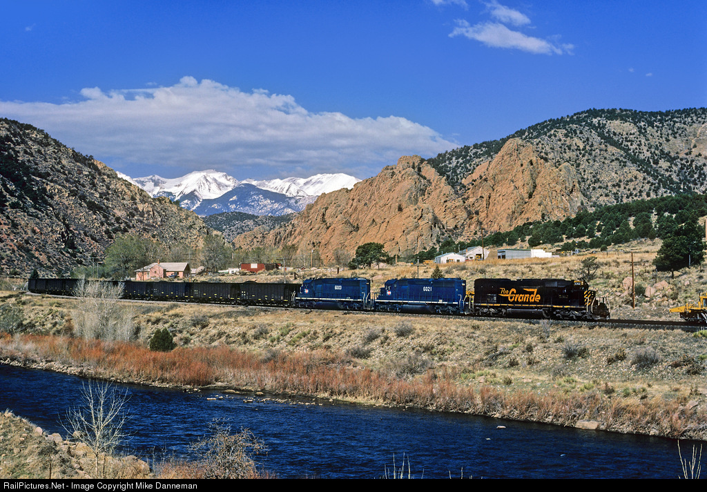 A Rio Grande DEGX coal train heads eastbound along the Arkansas River at Cotopaxi, Colorado, on April 23, 1984. Tunnel Motor (SD40T-2) No. 5362 leads Missouri Pacific SD40-2s Nos. 6021 and 6003 on this train headed to Mississippi via the scenic Tennessee Pass route, and MoPac east of Pueblo.