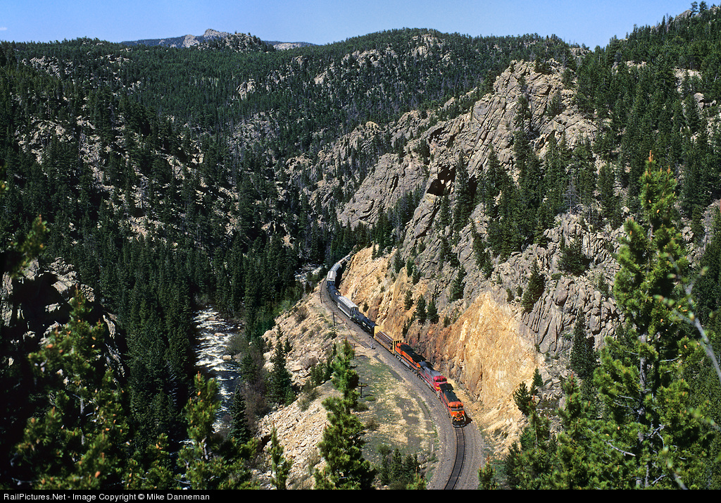 On May 27, 1998, a westbound Burlington Northern Santa Fe manifest freight approaches Pinecliffe, Colorado. The lead locomotive is passing the site of former Tunnel 28, daylighted in 1951.