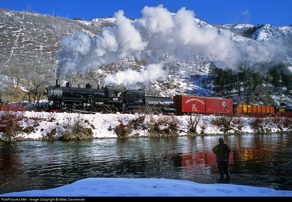 As a trout fisherman casts his line into the icy waters of the Provo River, Union Pacific 2-8-0 No. 618 thunders by with a freight in Provo Canyon on a cold February 6, 2007. This train was operated by Heber Valley Railroad as part of a winter weekend photo special.