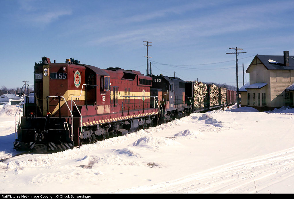 | DMIR units normally could be found working on the WC almost year round after the WC started to snare a substantial amount of all rail ore runs from Duluth to connections in Chicago. These were most often HP payback units as big WC power often operated right through to the Iron Range mines on DMIR rails. A group of hi-nosed DMIR SD's spent most of the end of there careers on the WC serving on local/road freights. Generally liked by most engine crews the heavily ballasted SD's pulled well and were reliable units. DMIR 155 is trailed by WC SDL39 583 as they depart Trout Lake westbound for Marquette with 42 cars. |