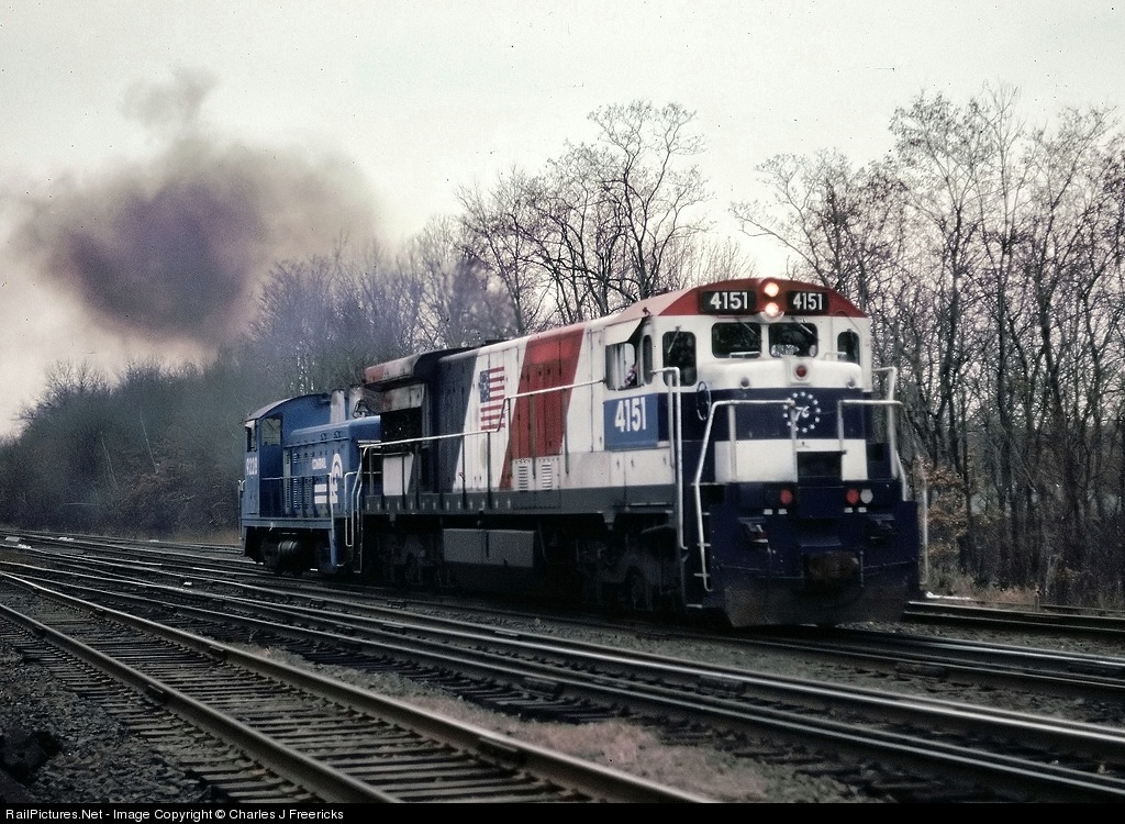 | Quite honestly I'm not sure what this was all about, or how the U34CH ended up facing south (RR east) which I never saw another one do here, but an NJDOT U34CH (the Bicentennial unit) runs through light with a Conrail NW2 behind her. |