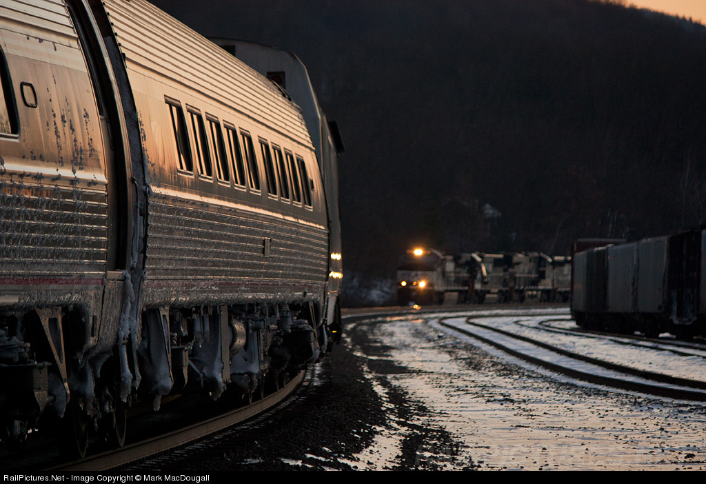 | The westbound Amtrak 43(10) Pennsylvanian, running as "07T" on NS, makes a dusk station stop at Tyrone as 14G comes east on a very cold December evening. The cars on the right are the pickup for the Nittany & Bald Eagle. |
