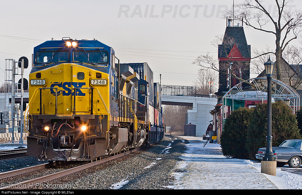 | CSXT 7348 flys westbound with more intermodal containers, interestingly enough the 7348 has the class lights removed and plated over like NS had done with all former CR locomotives |
