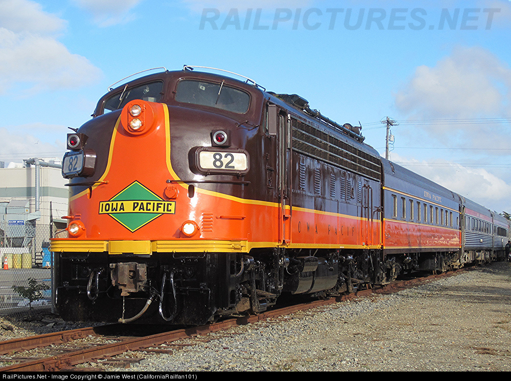| Iowa Pacific F9PHA #82 is former WCRC 82 from the Spirit of Washington Dinner Train. She now serves on the former Santa Cruz Branchline in Santa Cruz, CA as Iowa Pacific F9PHA #82. Here, #82 sits idling at the depot waiting to take the Inagural Train on another run. |
