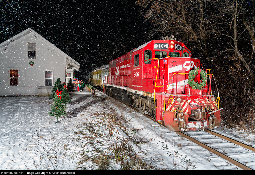 Saturday evening's Vermont Rail System Polar Express train out of White River Junction, Vermont, arrives at the Lewiston station in Norwich, Vermont, behind CLP GP40-2 306. Santa's elves are seen greeting the arriving train during the onset of a snowstorm that eventually produced around 14 inches of new snow.