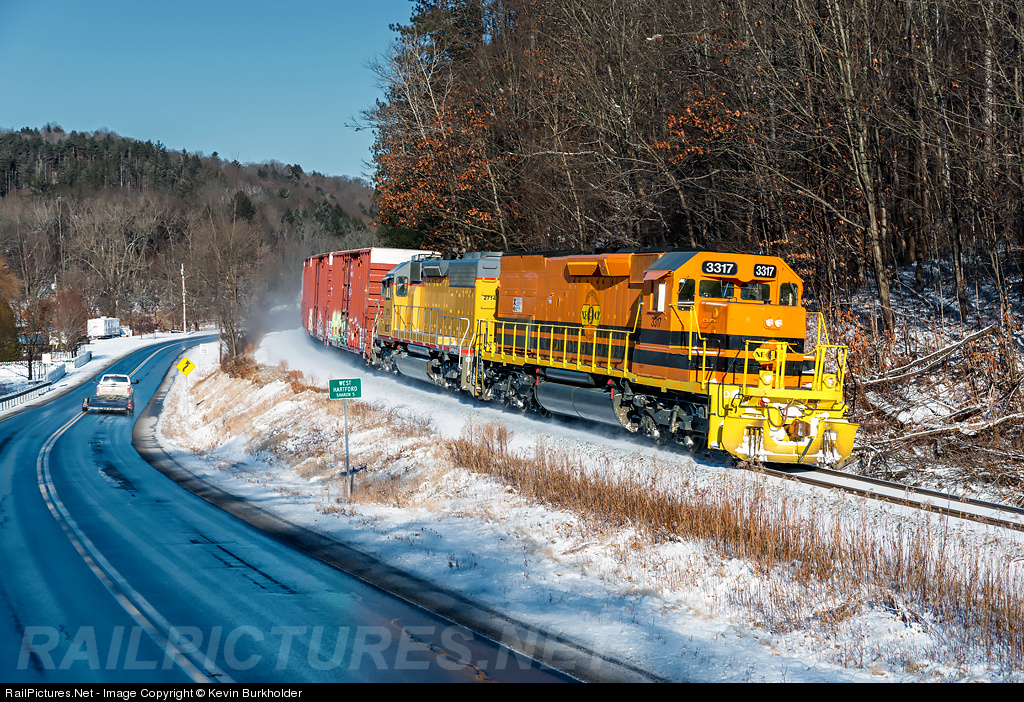 | GWI-painted NECR SD40T-2 3317 leads the NECR SD40M-2 2714 southbound through West Hartford, Vermont with an overnight light snowfall blanketing the ground in fresh coating of white powder. |