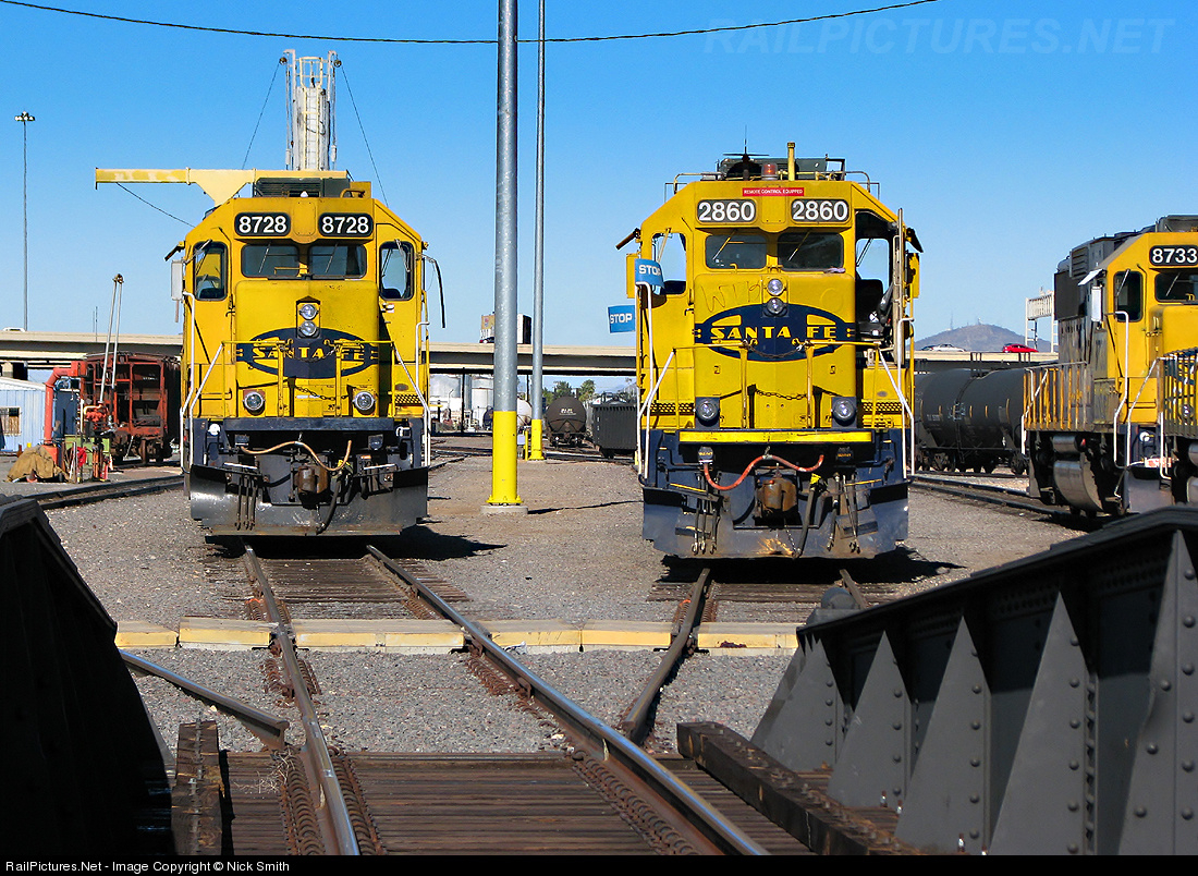 | Plenty of ex-Santa Fe motors occupy the diesel servicing facility of BNSF's Mobest Yard in Phoenix, AZ. BNSF 2860 and BNSF 8728 await work just short of the turntable on the south side of the yard on a quiet Thanksgiving afternoon. |