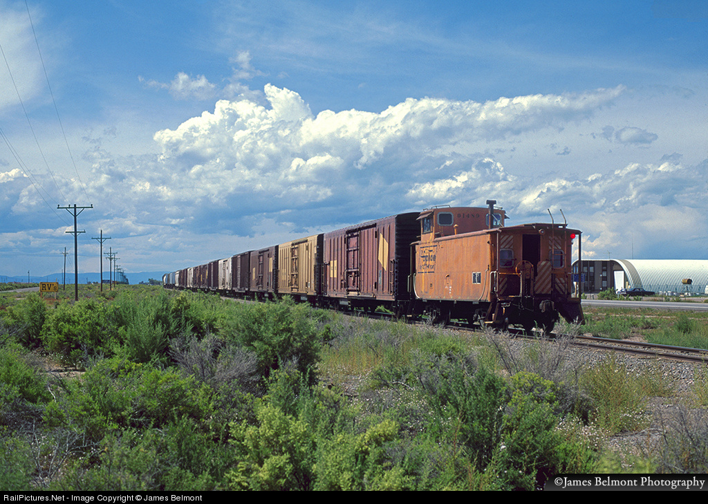 SP's Creede Local heads west through the San Luis Valley with 16 cars of interchange traffic for the San Luis Central Railroad at Sugar Junction.