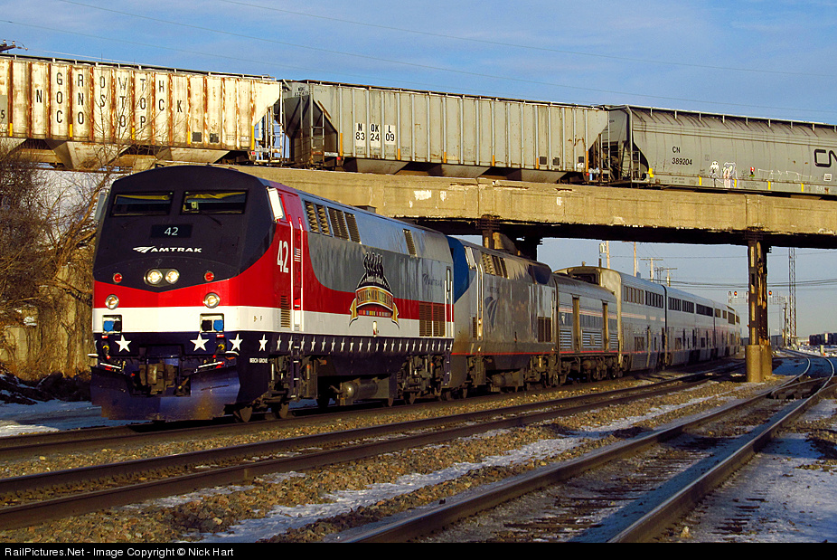 | During a short, but nice pocket of sun, the Amtrak "Salutes Our Veterans" unit heads west under the CN Chicago Subdivision in Berwyn. |