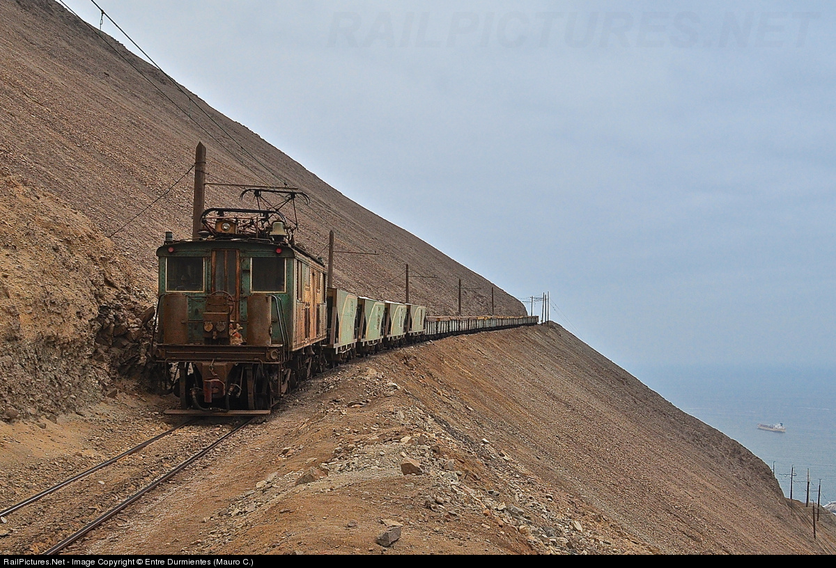 | The electric locomotive GE BoxCab No. 601 "Andrea" and Soquimich train skirts the abyss of the "Cerro La Cruz" (cross hill) in Barriles ravine, beginning to go down to the urban area of Tocopilla, and Soquimich private harbour. |
