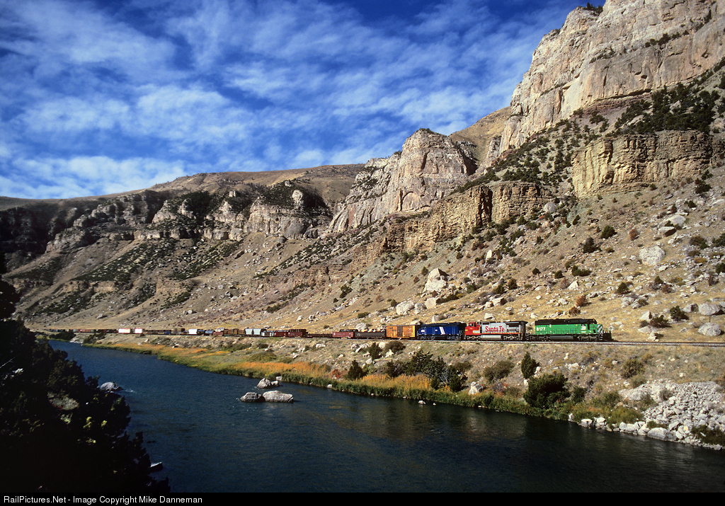 A westbound BNSF freight rumbles through scenic Wind River Canyon at Dornick, Wyoming, on October 2, 1997. Leading the colorful consist is Burlington Northern SD40-2 No. 8177, followed by Santa Fe C40-8W No. 901 and Montana Rail Link F45 No. 390.