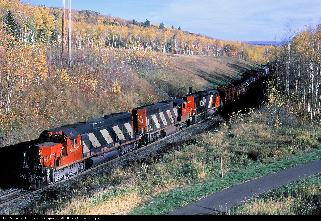 | CN 5097,9549 and 5317 struggle upgrade away from Lake Superior near Nopeming. A few fall colors were still on the trees this bright mid October afternoon. |