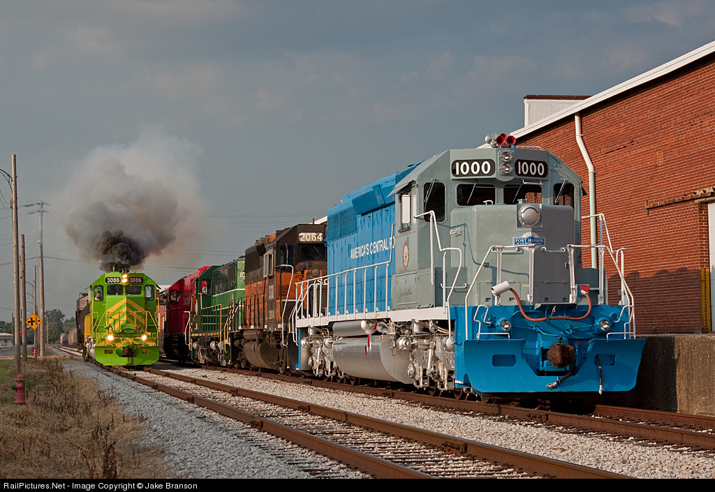| Illinois Terminal-inspired SD40-2 #3086 belches a nice puff of smoke as it passes a line of stored power while switching on Respondek RRC's Port Harbor Railroad. The stored units include SD40-2 #1000, two GP40s from Canadian Pacific (one still in SOO/MILW bandit paint), and a former ARR GP8. |
