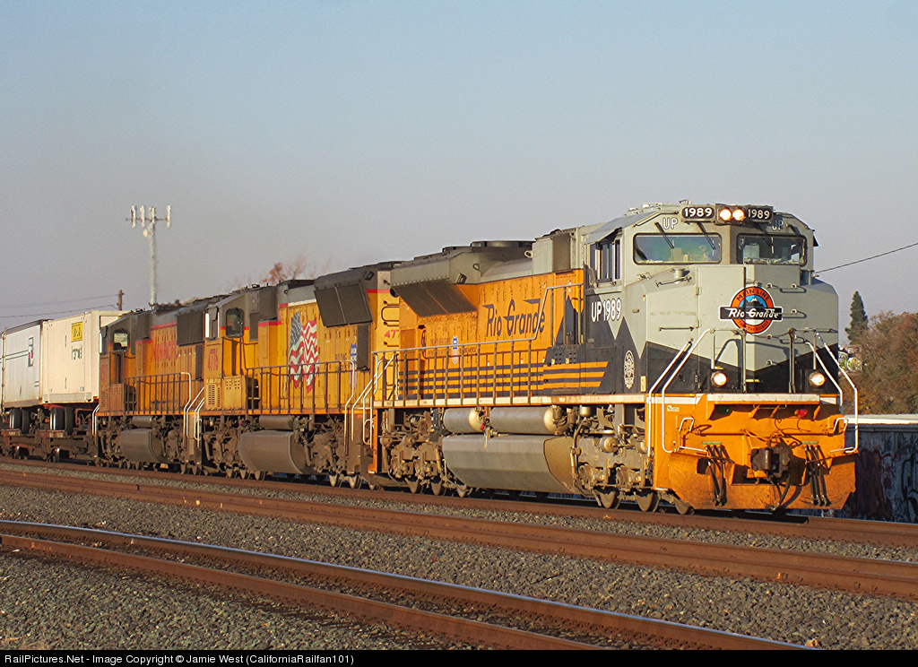 Union Pacific's "Denver & Rio Grande Western Proud Heritage" SD70ACe, UP 1989, leads the Brooklyn, OR to LATC, CA Z-train (ZBRLC-20) through Stockton at CP El Pinal.