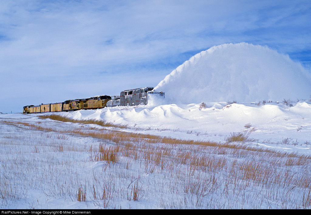 Union Pacific rotary snowplow No. 900082 is eastbound approaching a snowbound Sharon Springs, Kansas, on New Year’s day in 2007. Trains have been stranded there for several days, and this plow operated east from Denver to open up the Kansas Pacific line to Salina. High winds and 32 inches of snow buried the town during the December 29-30 storm. Providing motive power for the rotary train is a pair of GEs, with three support cars trailing the power, along with a backwards-facing EMD SD70M, to be used to pull the outfit westward out of a stuck position, if needed.