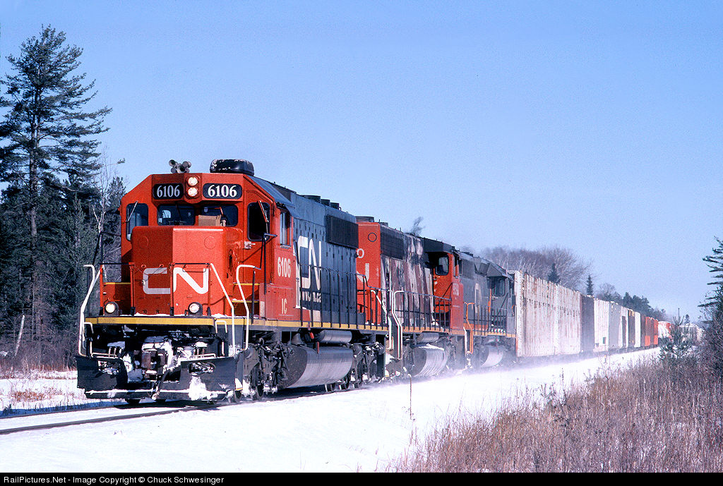 | By 2007 I was no longer shooting many slides in my home area as most trains ran under cover of darkness or against the sun. On rare occasions CN 412 would fall well off schedule and if by some miracle the sun would cooperate I'd dust off the Nikon's for a few last chases in Upper Michigan. This is one of those rare moments and thankfully I was blessed with older power as IC 6106, CN 9590, WC 6901 roll past Gilchrist with a long train 412. |