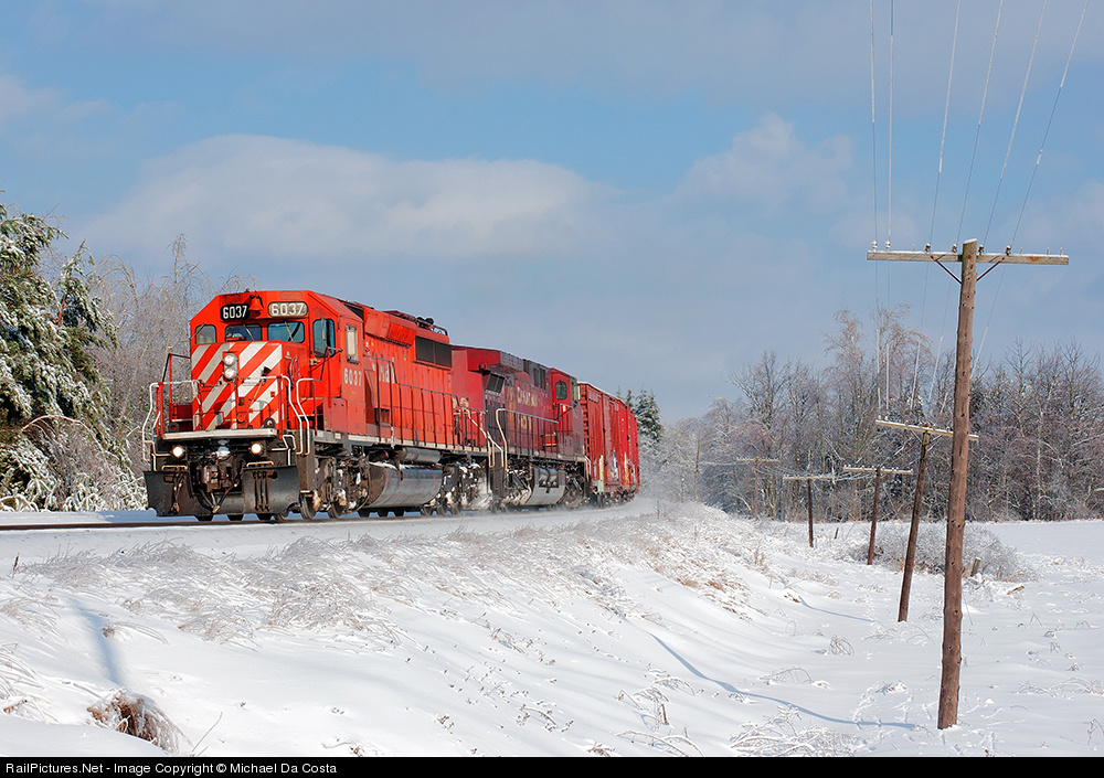 | With all hope being lost on shooting a southbound train on the MacTier Sub, my scanner crackled to life when CP 6037 S called the Palgrave mileboard. CP6037 and CP9595 lead CP 420 through Palgrave on this nice winters day. |