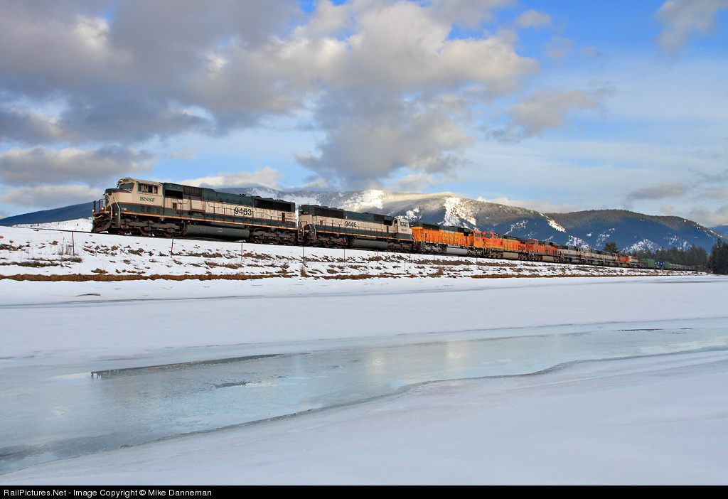 BNSF’s HKCKPAS manifest freight passes an iced-over Frog Pond just west of Trout Creek, Montana, on January 24, 2013. I’m not sure why the train has such a gargantuan locomotive consist; Seven EMD SD70MACs, surrounding two GE C44-9Ws and a GE ES44C4.