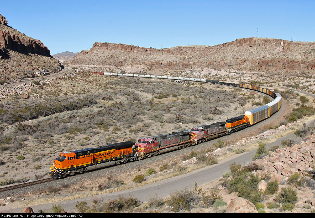 | Passing through Arizona's Kingman Canyon, this Belen to Barstow freight eases down the canyon on it's westbound run lead by BNSF 7170. No doubt the last 3 units in this lashup made many trips through here for the ATSF. |