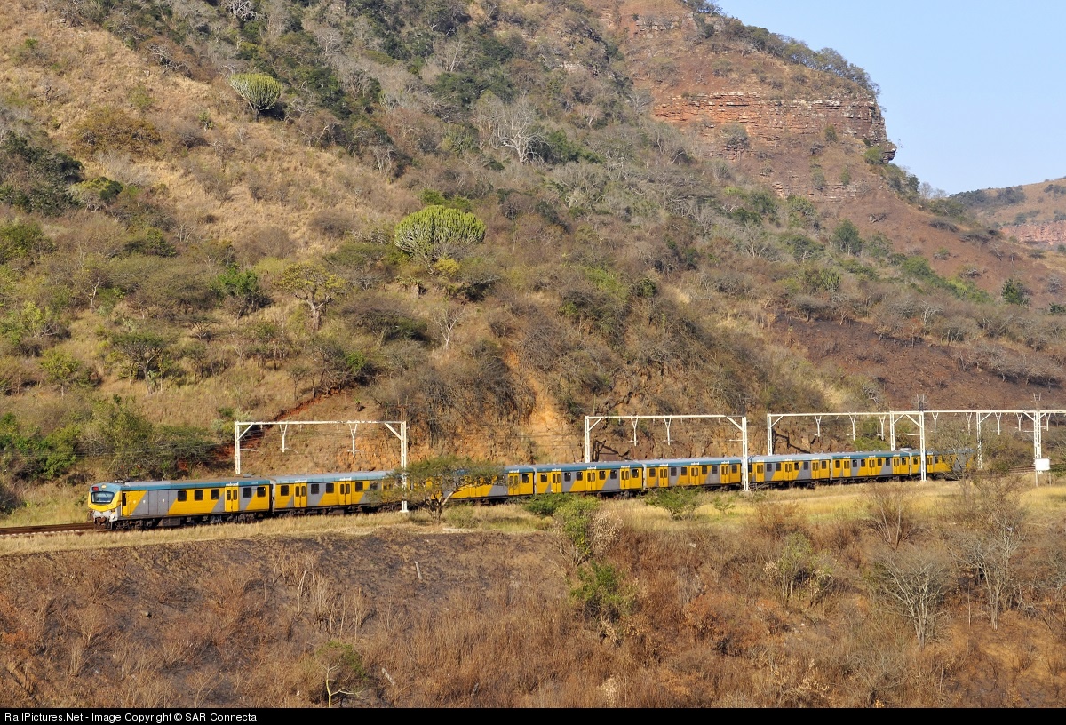 An eight coach, Type 10M5, Metrorail set passes through the hilly area of Shongweni on a winter afternoon and is bound for Cato Ridge, having started its journey at Durban Station. There is a regular Metrorail service between Durban and Cato Ridge, with the trains stopping at all stops along the way, providing locals living in remote "rural" areas with reliable transport, especially the school kids to and from their schools.