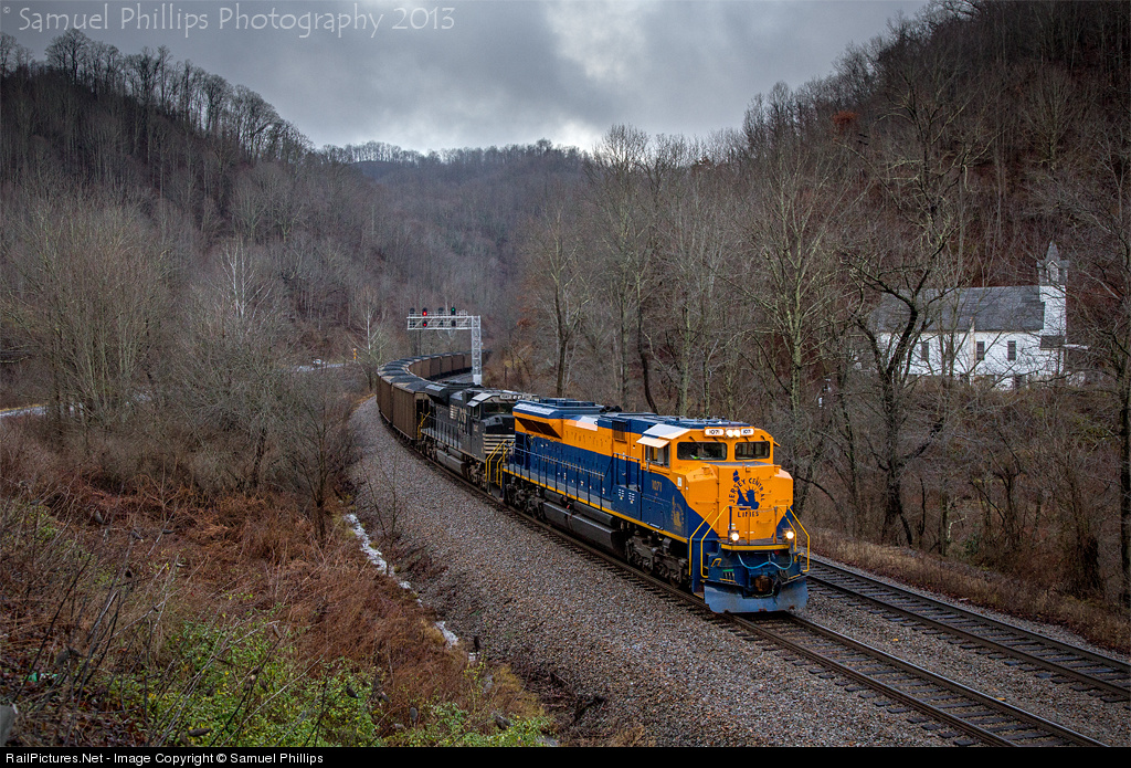 With sanders going and locomotives in notch-8, No. 776 tackles Elkhorn Grade in Switchback, W.Va., led by NS's Central of New Jersey heritage unit. The train weighing just over 15,000 tons is down to a crawl while assaulting the infamous ascent that has caused many stall-outs, and even a line relocation in the 1950's due to its original severity.