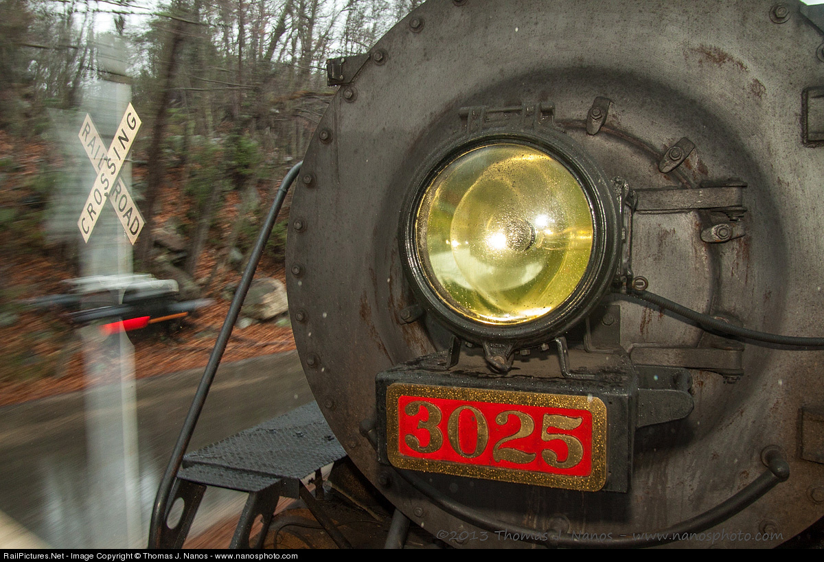 | Valley Railroad Mikado No 3025 pulls a Santa Special back to Essex, Connecticut as they pass over the Old Deep River Road crossing in the Centerbrook section of Essex. |