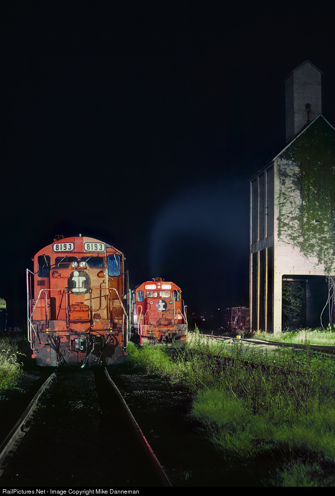 Under the imposing coaling tower at Centralia, Illinois, on a September 1984 night, Illinois Central locomotives idle the evening away. Paducah-rebuild IC GP10 No. 8193 stands one track over from IC SD40 No. 6002, exhaust eddying up into the black sky.