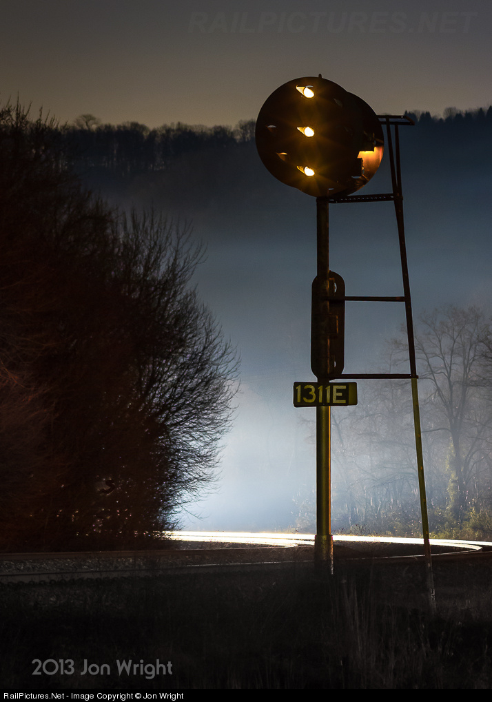| A quiet night along Norfolk Southern's Middle Division of the Pittsburgh Line is on break as an eastbound approaches the block from the west and lights up the PRR position Light signals and a westbound intermodal train prepares to round the curve illuminating the fog and tracks ahead silhouetting the mast signal. |