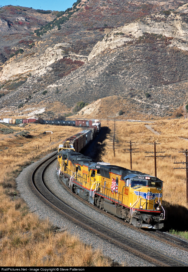 | On Union Pacific's original transcontinental mainline, SD70M 5022 urges freight eastward through Echo Canyon, Utah near Emory, on Sept. 29, 2005. |