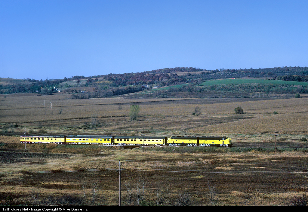 A Chicago and North Western inspection train approaches Waukesha, Wisconsin, in October 1983, in a view from Sunset Drive west of town. Powering the three car special is F7As Nos. 401 and 402. C&NW just rebuilt the line from Clyman Junction through Watertown to Jefferson Junction to serve Ladish Malts at J. J., and Milwaukee via a connection to the Adams Line. Now, nothing but the sounds of bike tires crushing limestone gravel on the Glacial Drumin State Trail pass this way; not long after this photo, C&NW abandoned this line from Waukesha to Jefferson Junction.