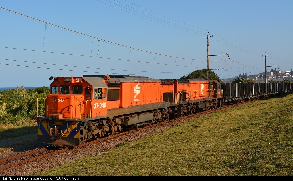| Class 37 Diesels, 37-048 & 37-088, are seen here approaching the Ilfracombe Station Crossing on the KwaZulu Natal South Coast, having just left Umkomaas late on a winter afternoon with a load of empty Type STJ Wagons (Timber Wagons) and are bound for Bayhead in Durban. One hundred of these Class 37 diesels were placed in service in South Africa during 1981 and 1982. They were designed by General Motors Electro Motive Division as type GT26M2C, and were built by General Motors South Africa.