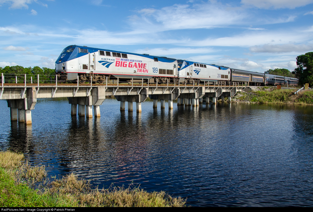 | Amtrak's northbound Silver Star rockets out of south FL on Christmas Day with the Big Game unit leading, wrapped in honor of the annual Texas-Oklahoma Red River Shootout football game at the Cotton Bowl in Dallas, TX. |