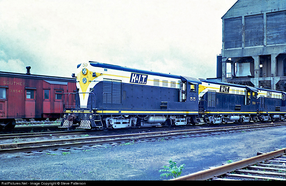 Kentucky & Indiana Terminal 1000-hp Fairbanks-Morse H-10-44's, including No.s 55 and 59, have tied up for the day on July 14, 1961 at Louisville, Ky. [The Southern Ry. bay window caboose appears to have wooden window frames.]