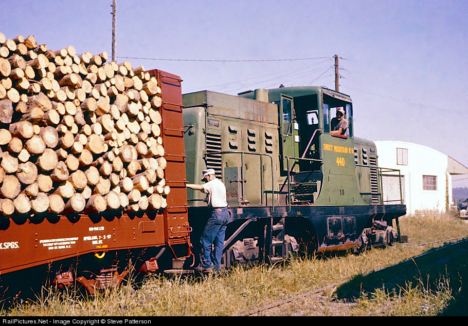 | Smoky Mountain's 44-ton GE, appropriately numbered 440, handles pulpwood at Sevierville, Tenn. on July 11, 1957. |