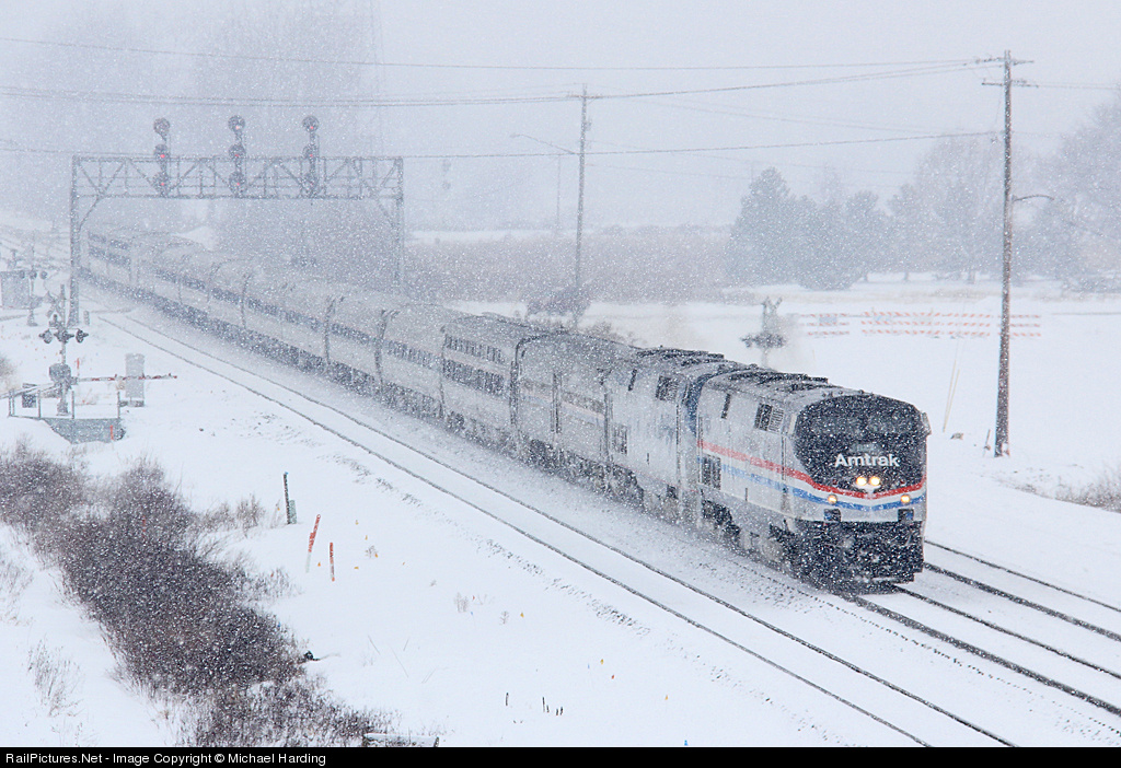 At the leading edge of a sizeable blizzard and severe cold front hitting NW Ohio a very late eastbound Lakeshore Limited rolls through the heavy snow at Vickers.