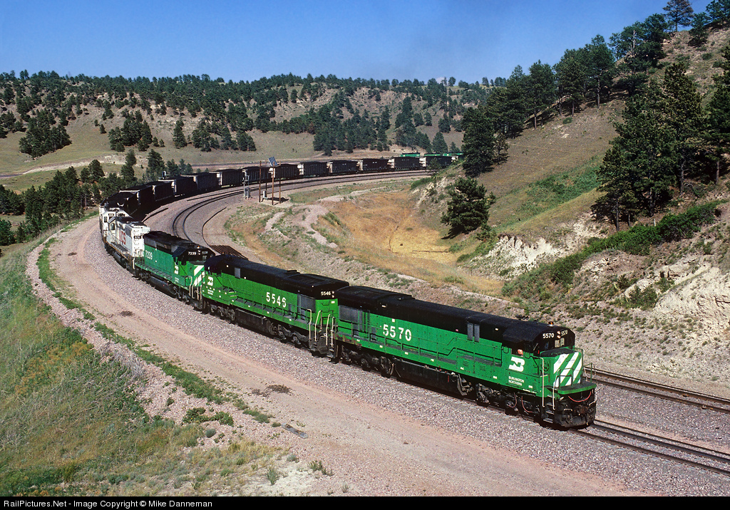 A Burlington Northern coal train grinds up Crawford Hill west of Belmont, Nebraska, on July 2, 1989. The train is powered by two BN GE C30-7s and three EMD SD40-2s (BN 7239, along with Kansas City Southern Nos. 691 and 666) and is pushed on the rear by three more BN SD40-2s splicing a fuel tender, which are just disappearing behind the hillside on the track below.