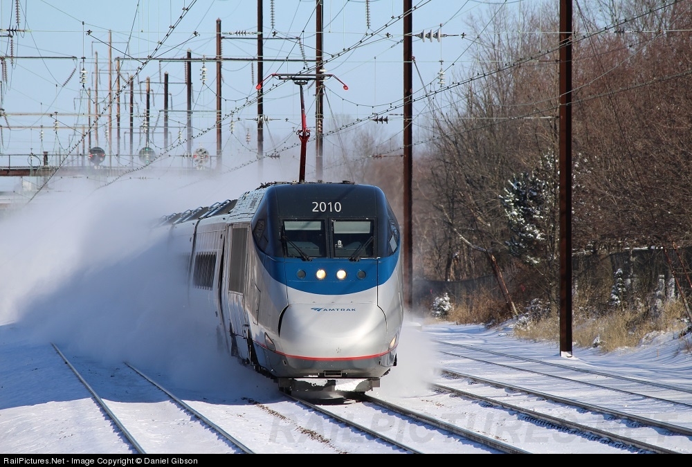 With temperatures in the teens, Amtrak's Acela Express charges south, stirring up a cloud of snow behind it. A rarity for the Acela, this train was running almost 3 hours late. However, with the storm now over Amtrak crews were working hard to restore service back to on-time.