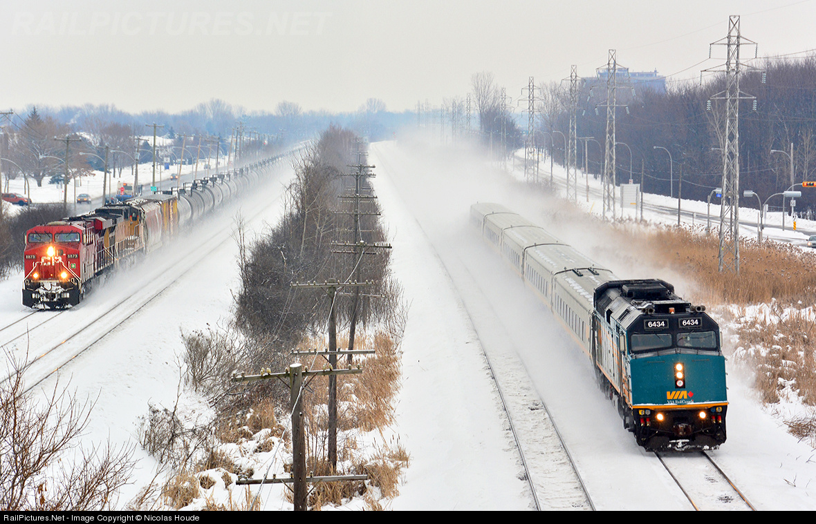Race between CP and VIA! CP 609, with an GE ES44AC in lead, race with VIA #55, with a EMD F40PH-3 in lead. At this place, the CP Vaudreuil Subdivision follows the CN Kingston Subdivision between Lachine, Qc and Dorion, Qc. I'm sure you know already the winner of the race! :-)