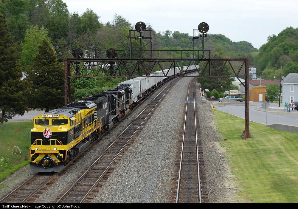 NS 21J drifts downgrade with the Virginian on the point as it passes under the classic PRR signal bridge in Summerhill. This signal bridge along with all the other PRR PPL's will become a thing of the past as NS plans to replace all of them in 2014.