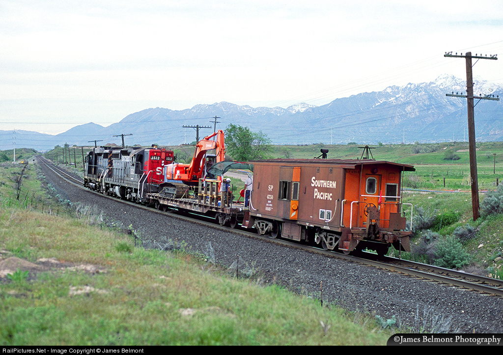 A work train assigned to install a fiber optic cable line along the former D&RGW emerges from the Jordan Narrows into the Salt Lake Valley approaching Riverton on May 18, 1993.