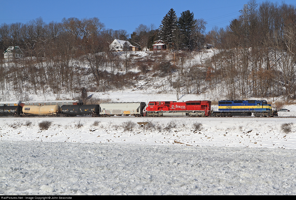| A loaded ethanol train rolls along an ice choked Mohawk River at Lock 10 on its way to a layover at Selkirk Yard prior to heading for its New Jersey destination. DM&E "City of Arlington" leads a very rare visitor to these parts, Indiana Railroad SD9043MAC #9002. |