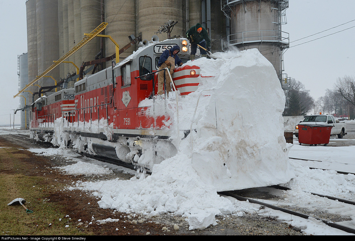 The Bloomer Shippers Line Railroad used two Geeps to plow out the entire railroad Friday. Former Northern Pacific 7591, the Bloomer's first loco, gets some attention as trackworkers use scoop shovels to remove snow after busting drifts near Cropsey, Illinois on Friday, Jan. 10, 2014. Steve Smedley photo