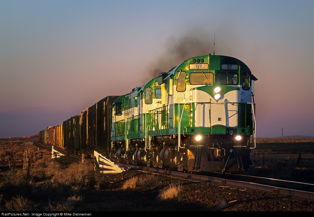 | With the very last sunlight of the day lighting up the high desert, Apache’s Holbrook Turn passes milepost 15 at Pig Farm, Arizona, on March 7, 2005. |