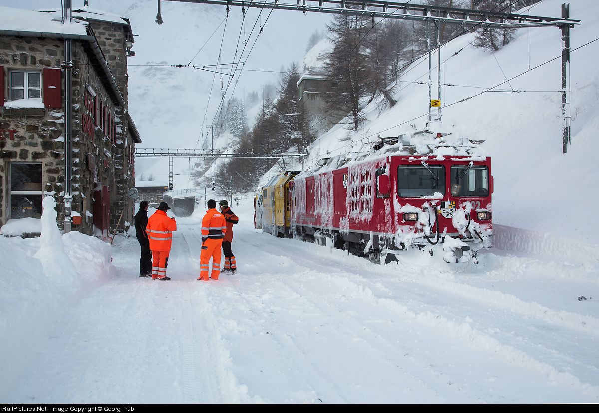 | The snow fighting crew from Poschiavo with Gem 4/4 # 802 and snow blower X rot mt # 95403 just returned from Ospizio Bernina to Alp Grüm (2091 meter a.s.l.). There was avalanche danger and passenger traffic was interrupted for about 5 hours till the strong wind ceased. |