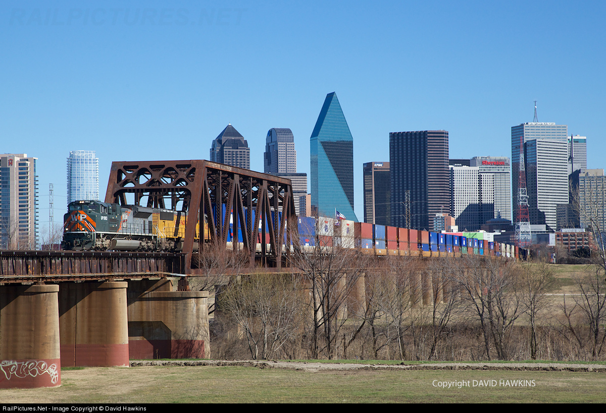 Western Pacific heritage leads a stack train to California crossing the Trinity River trestle built by the Texas & Pacific Railway.