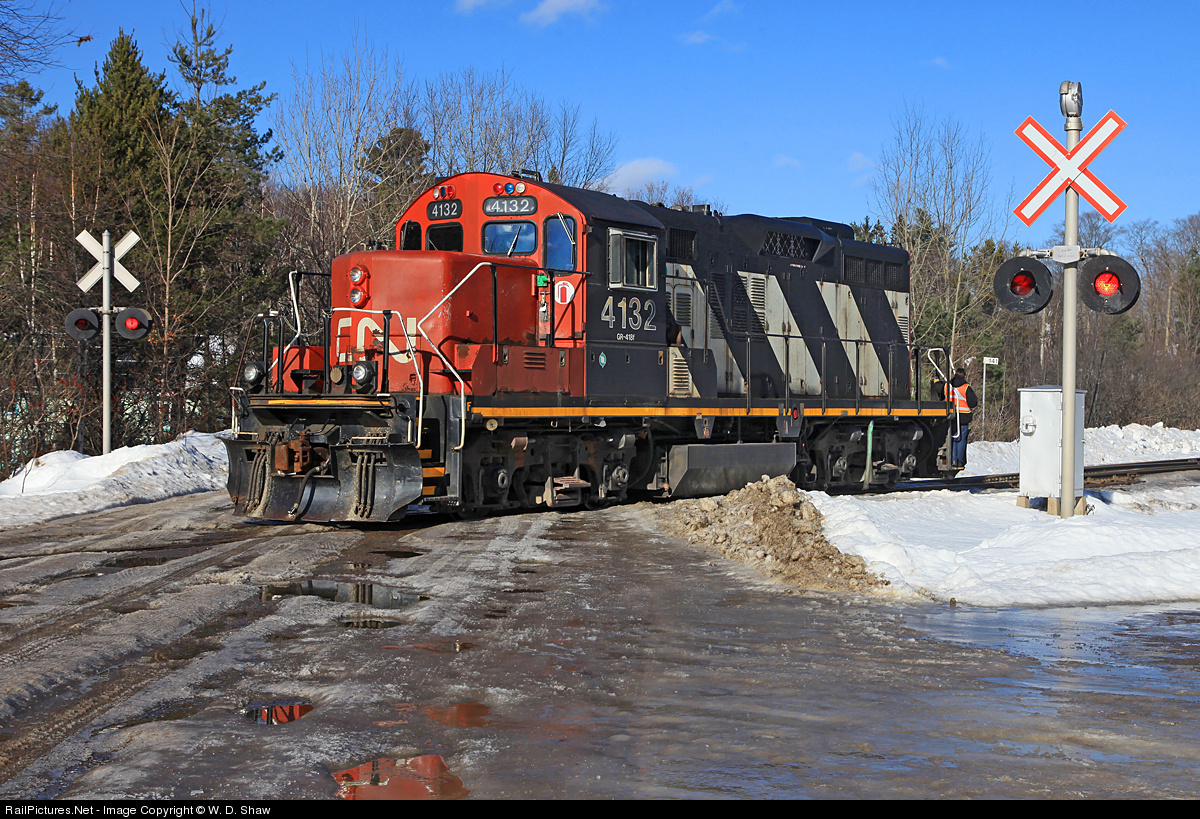 4132 is framed by the Domtar Road crossing signals as 595 prepares to work the Panolam plant at Martins. Two days of rain followed by a warm sunny one have combined to get rid of most of the accumulated snow, but also made the back roads hell on car suspension systems!
