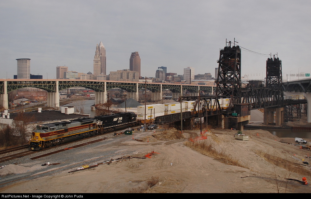 The Lackawanna heritage unit leads NS train 205 over the Cuyahoga River as it heads west through Cleveland.