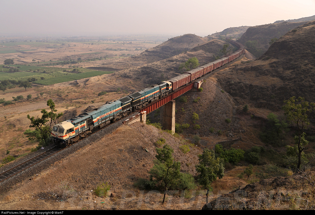 | With the motors in full dynamic braking, two WDG4s descend the Shindavane Ghat towards Pune with a boxcar rake. |