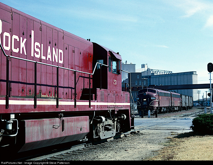Is the camera aimed the wrong direction? Rock Island U25B 231 was on the point of Train 4, "Golden State," standing at North Topeka, Ks. station as westbound mail Train 39 with two F units approached and will stop at the depot. No. 4 has just entered Union Pacific track to run to Kansas City, and No. 39 will soon be leaving U.P. property to be back on home terrain.